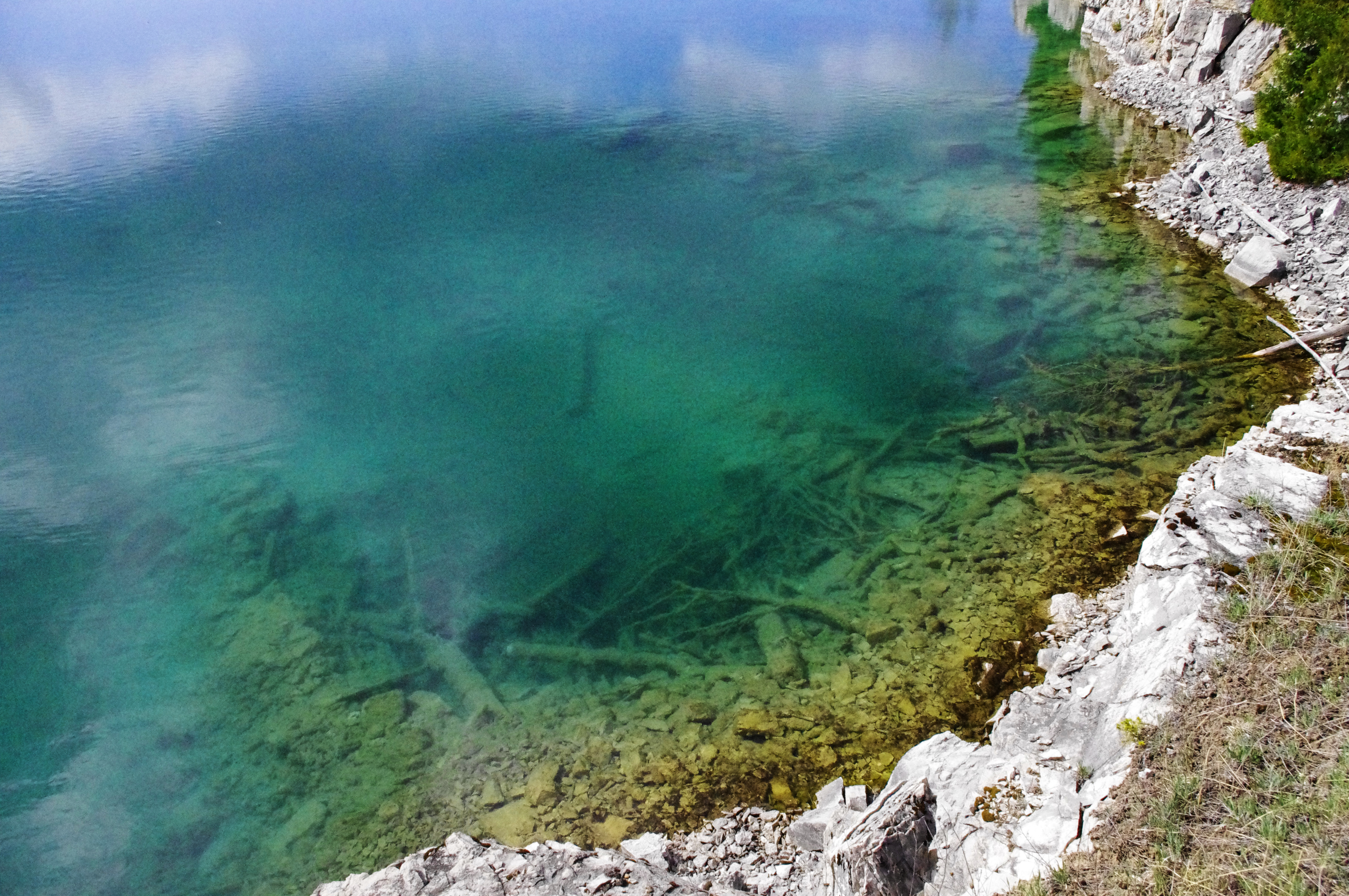 A colorful glimpse into a unique quarry in the Upper Peninsula of Michigan. This former limestone quarry was filled almost instantly when miners hit a natural spring. The white limestone gives the water an almost tropical color, while remaining crystal clear to see the sunken buildings, equipment, logs, and wildlife at the bottom (about 20 feet deep when this photo was taken). It used to be one of my favorite swimming places, but was drained in recent years to resume limestone mining.